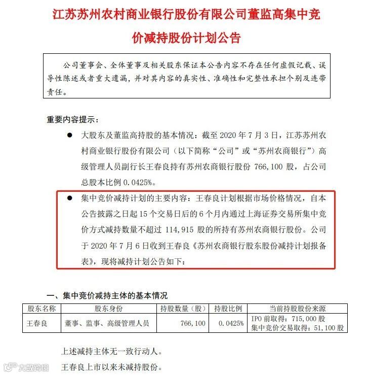 资料显示,苏农银行上述高管王春良获得苏农银行股份主要是IPO前取得和集中竞价交易取得,合计持有76.61万 股,占公司总股本比例 0.0425%。