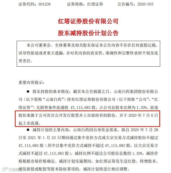 在券商股大涨之下,券商股的股东开始躁动。7月6日,减持最着急的当属红塔证券前十大股东之一的云南白药,由于红塔证券在2019年7月5日上市,7月6日刚好是该券商上市一周年,7月6日云南白药所持红塔证券的4711万股(占红塔证券总股本的1.3%)才刚刚解禁,云南白药就忍不住抛出减持公告。
