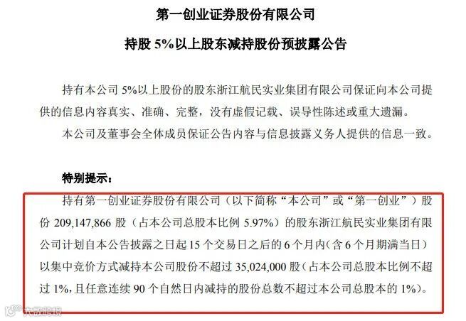 无独有偶,接连2天涨停的第一创业证券,第三大股东浙江航民实业集团也向该券商发来股份减持告知函,因航民集团主业升级、产业布局调整等原因,计划15个交易日后的6个月内减持不超过3502万股,占总股本不超过1%。