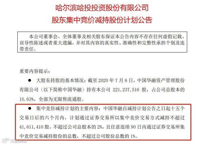 此外,哈投股份也公告,其第三大股东中国华融也要减持。资料显示,中国华融持有哈投股份2.21亿股占总股本10.63%,拟于公告之日起15个交易日后的6个月内,计划减持不超过4161.14万股,中国华融所持哈投股份来源于发行股份购买资产所得。