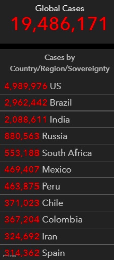 截至当前,全球新冠肺炎累计确诊超1948万例,死亡72万例。美国确诊人数近500万例,死亡超16万例。