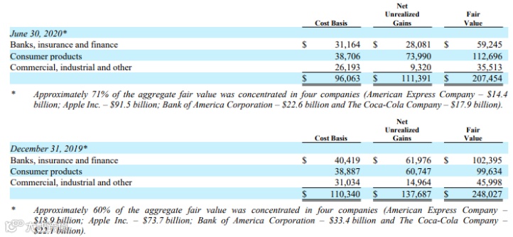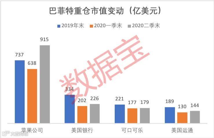 巴菲特前四大重仓股合计贡献了其二季末约71%的股票持仓市值,除苹果外,另外三只重仓股美国银行、可口可乐和美国运通的二季末持仓市值均未超过上年末水平。