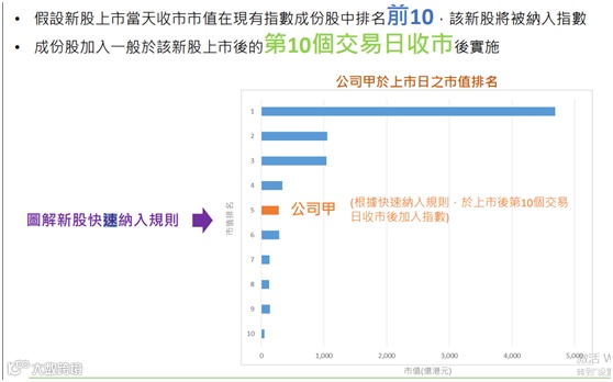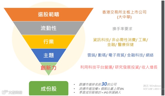 此外,恒生科技指数的成份股每季进行一次检讨,而且设有快速纳入机制,容许新上市的大型科技企业更加适时地被纳入指数。即,假设新股上市当天收市市值在现有指数成份股中排名前10,该新股将被纳入指数,成份股加入一般于该新股上市后的第10个交易日收市后实施。