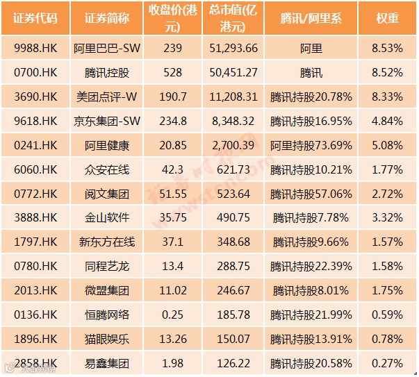 值得一提的是,上述30只成份股中有12家为腾讯系,权重合计达到36.04%,阿里系有2家,权重合计13.61%。(注:众安在线同时也为阿里系企业)