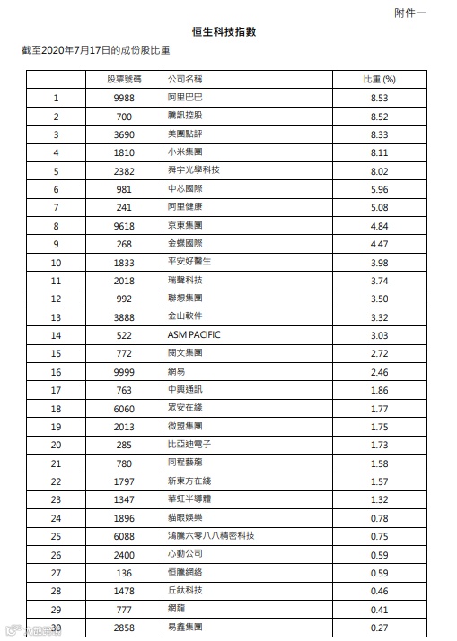 此次指数选股准则主要考虑合资格公司是否利用科技平台进行运营,研究开发占收入比例及收入增长。经此标准筛选后,纳入恒生科技指数的30只成份股如下: