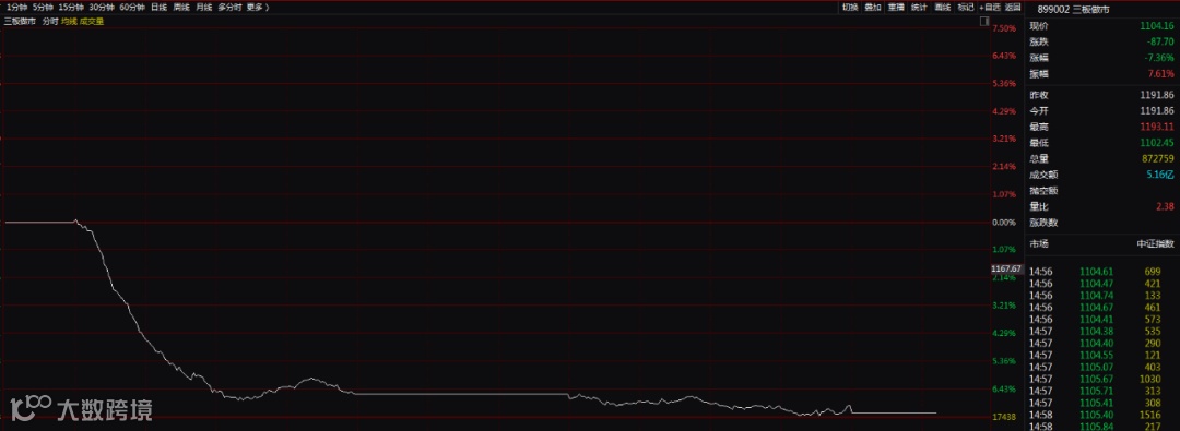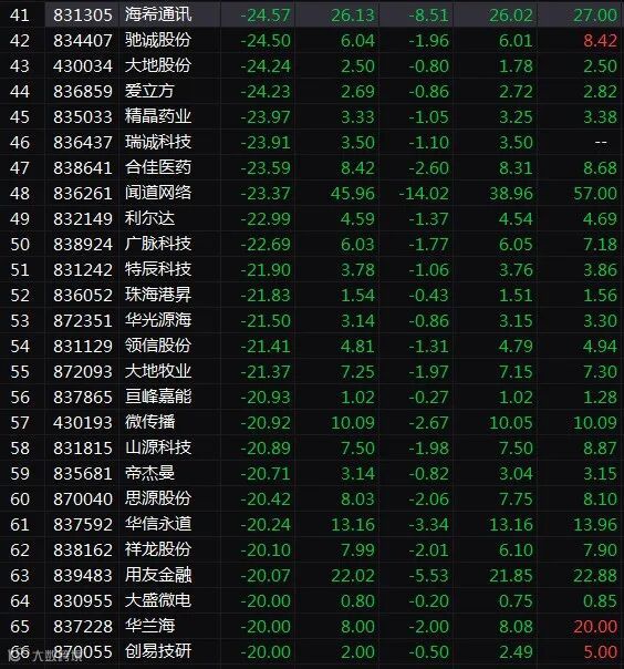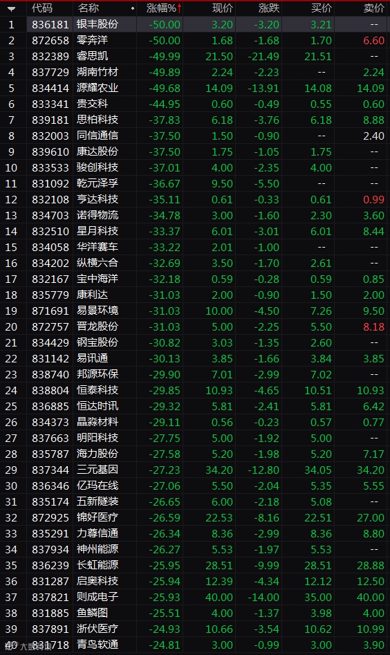 然而,最惨的还不是精选层第一批股票,而是新三板的创新层个股。受精选层首日表现低于预期影响,投资者大面积从创新层逃离,导致这个板块的做市股票集体杀跌,集体竞价的股票更是惨不忍睹。整个创新层跌幅超过20%的个股达66只,银丰股份、零奔洋跌幅超过50%。三板做市指数杀跌7.36%。