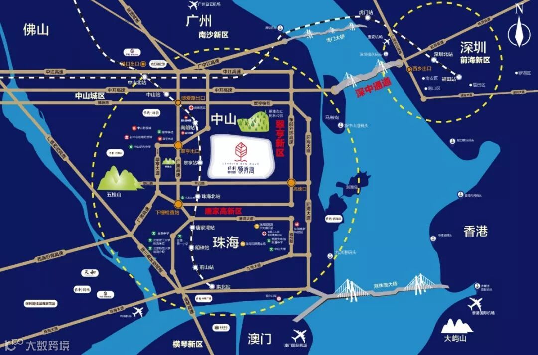 保利碧桂园领秀海项目位于中山交通重点位置——翠亨,享有双桥一港(全中山最近深中通道、港珠澳大桥),双轻轨站(翠亨站、珠海北站),并拥有四快线、四高速,扼深中通道头牌,是桥港经济区门户。超强的交通体系让翠亨新城坐享不可复制、不可比拟的城市动脉优势。