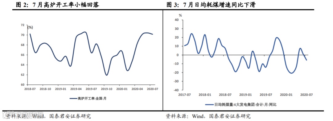 7月以来,高炉开工率小幅回落,日均耗煤同比下滑。7月高炉开工率为70.13%,相对6月70.41%小幅回落。7月以来6大发电集团日均煤耗量同比下滑5.86%,增速较上月缩小7个百分点。