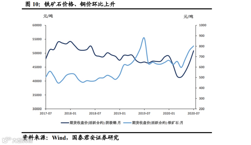 铁矿石价格、铜价环比上升。7月以来,铁矿石期货价格环比增速为5.56%,为802.31元/吨。阴极铜期货收盘价为50,850.00元/吨,较6月环比上升9.14%。