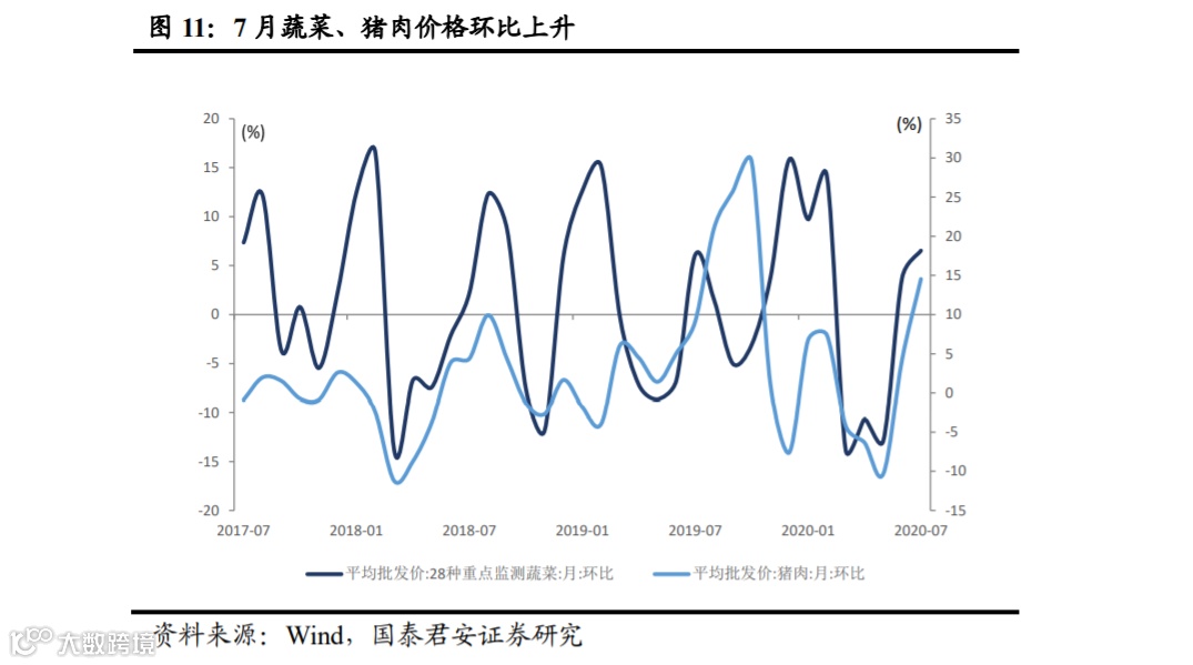 2020年7月以来,蔬菜、猪肉价格环比上升。7月上旬,28种重点监测蔬菜均价为4.31元/公斤,较6月环比上升6.54%。22个省市平均猪肉价格为48.67元/公斤,较6月环比上升14.55%。