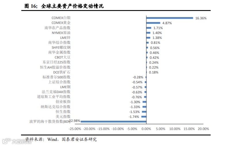 大宗商品涨跌不一。贵金属普遍上涨,COMEX黄金、南华贵金属指数及COMEX白银分别上涨4.87%、9.44%及16.36%。农产品方面,CBOT大豆、CBOT玉米及南华农产品指数分别上涨0.42%、0.75%及1.71%。工业品方面,DCE铁矿石、DCE焦炭及DCE焦煤分别上涨0.18%、1.85%及2.19%。美元指数下跌1.74%。原油方面,IPE布油及NYMEX原油分别上涨0.74%及1.40%。