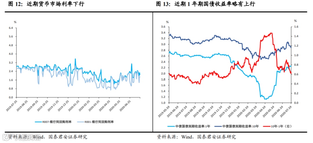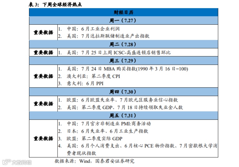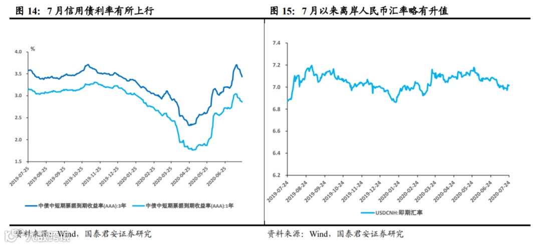 利率方面,货币市场利率有所下行。截至7月26日,R007较6月末下行96bp至2.0954%,R001较6月末下行42bp至1.8781%。1年期国债利率较6月末上行7bp为2.2446%,10年期国债利率较6月末上行4bp至2.8612%。信用债利率有所上行,AAA级中短期票据3年和1年的收益率分别较6月底上行23bp和12bp至3.4317%及2.8560%。汇率方面,离岸人民币即期汇率为7.0160,相对于6月末略微升值。