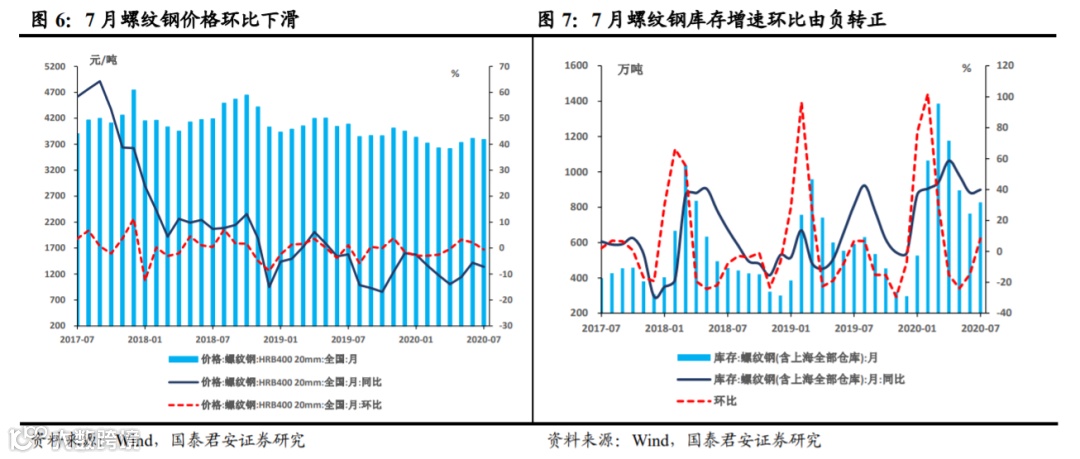 螺纹钢价格环比下滑、库存增速环比由负转正。7月以来,螺纹钢价格环比下滑0.58%,收于3,792.89元/吨。螺纹钢库存增速环比由负转正,增速扩大了23个百分点至8.4%,同比增速扩大了1.8个百分点至39.89%。