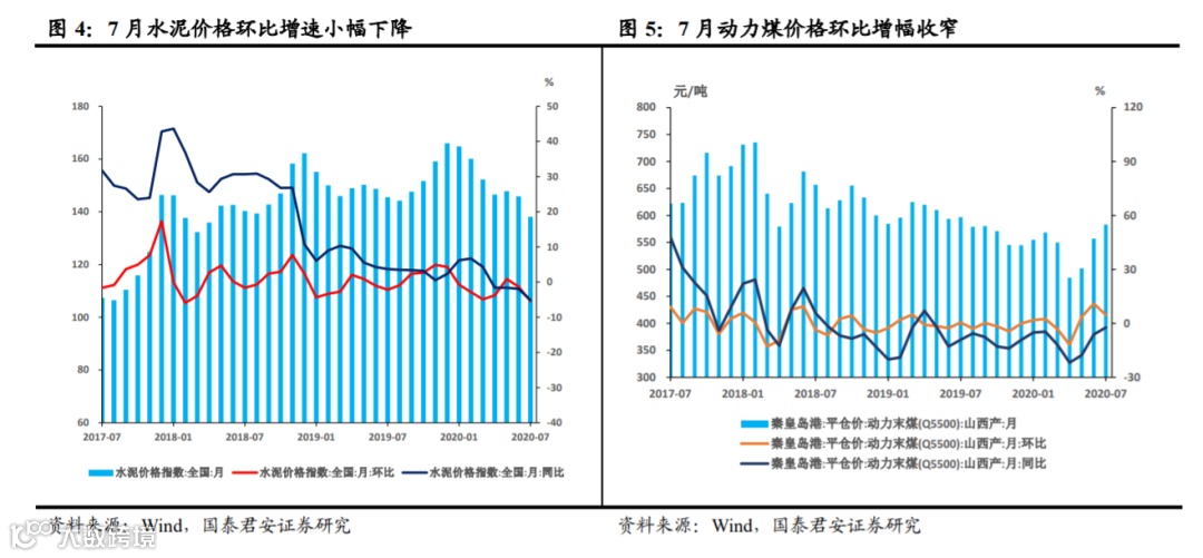 水泥价格环比增速小幅下降、动力煤价格环比增幅收窄。截至7月26日,水泥价格指数为138.08,环比增速较6月下降约4个百分点至-5.36%。动力煤价格环比增速较上月继续收窄6.3个百分点至4.66%,收于582.94元/吨。