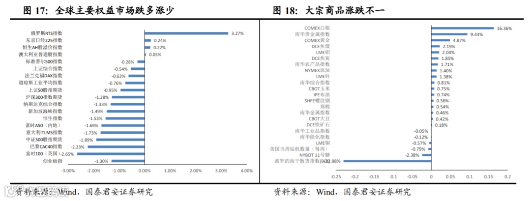 三、全球大类资产:权益市场及大宗商品涨跌不一