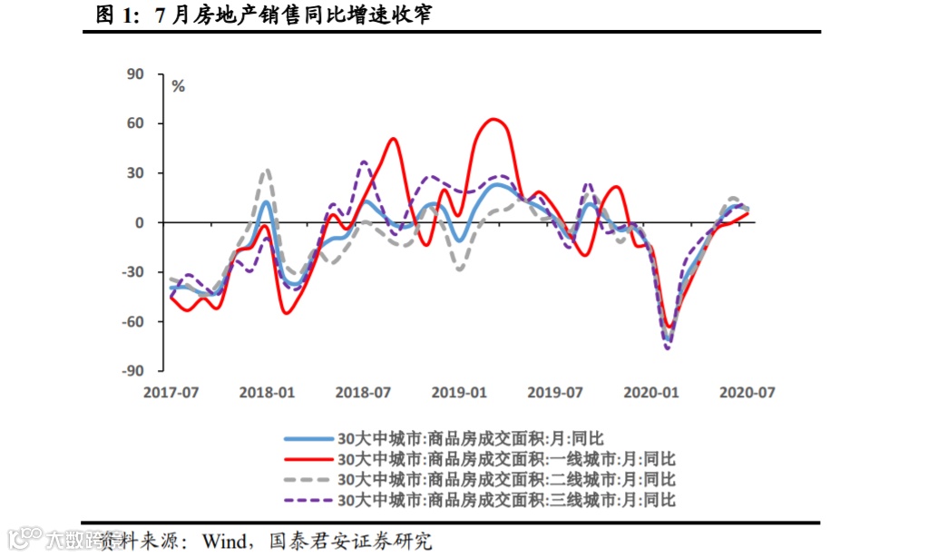 2020年7月以来房地产销售同比增速收窄。30个大中城市商品房成交面积同比增速为8.77%,较6月收窄约0.6点。其中,一线城市增速较6月扩大5.6个百分点至5.45%,二线城市增速收窄7.2个百分点至7.47%,三线城市增速扩大5.4个百分点至12.78%。