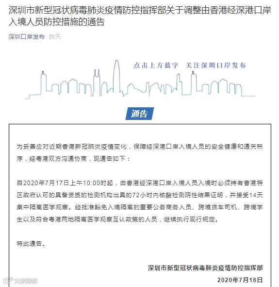 自2020年7月17日上午10:00时起,由香港经深港口岸入境人员入境时必须持有香港特区政府认可的具备资质的检测机构出具的72小时内核酸检测阴性结果证明,并接受14天集中隔离医学观察。经批准豁免入境隔离的重要公务商务人员、跨境货车司机、跨境学生以及符合粤港两地隔离医学观察互认政策的人员,继续执行现行规定。