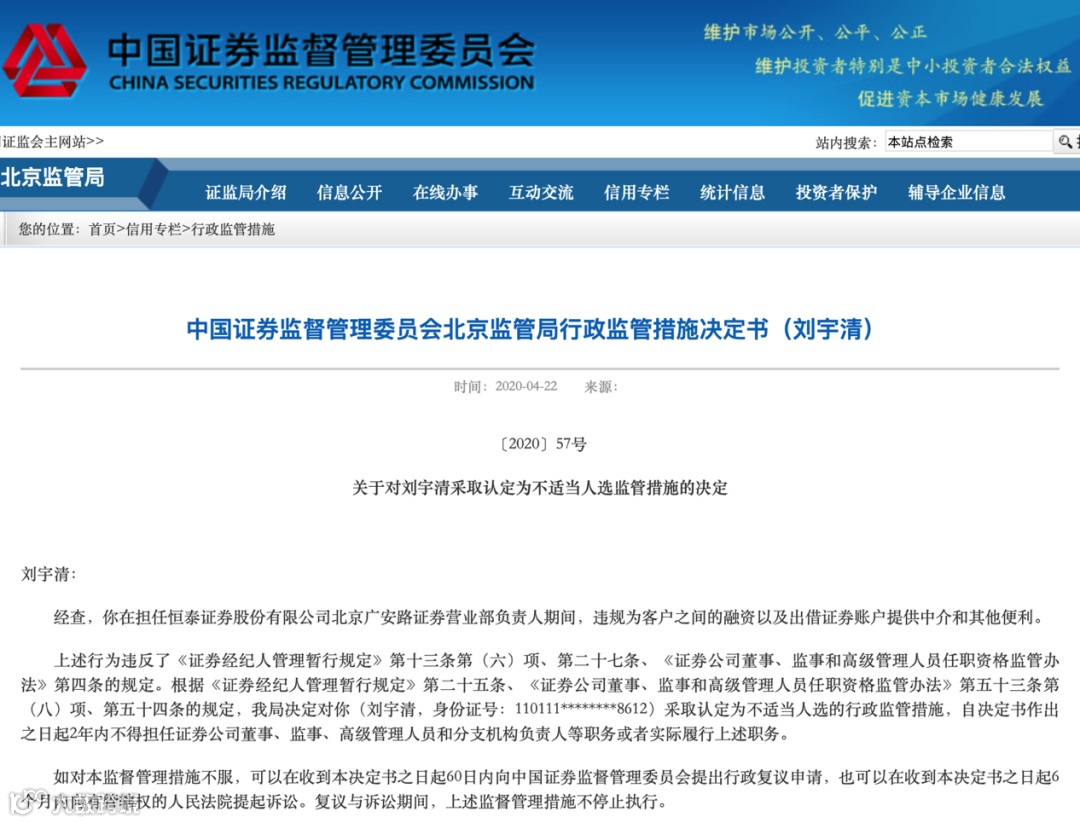 其中4月22日,同样是因为违规为客户之间的融资以及出借证券账户提供中介和其他便利,恒泰证券北京广安路证券营业部负责人刘宇清被北京证监局,认定为不适当人选,2年内不得担任证券公司董事、监事、高级管理人员和分支机构负责人等职务或者实际履行上述职务。