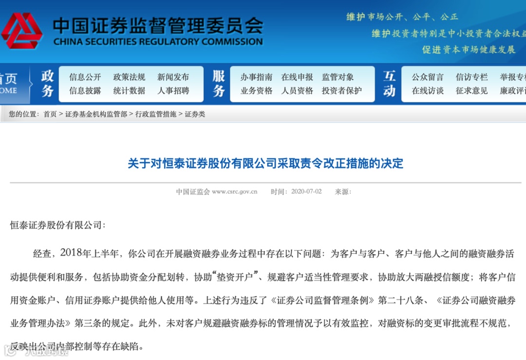 7月2日,证监会挂出3张罚单,针对2018年上半年,恒泰证券开展融资融券业务过程中存在的“为客户与客户、客户与他人之间的融资融券活动提供便利和服务,将客户信用资金账户、信用证券账户提供给他人使用”等问题进行问责。