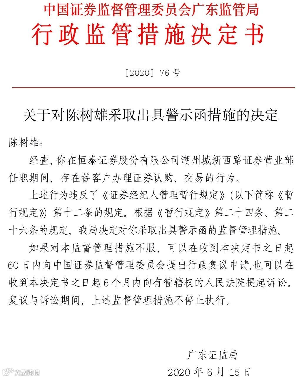 而到了6月15日,恒泰证券潮州城新西路证券营业部员工陈树雄,则被广东证监局查出在任职期间,存在替客户办理证券认购、交易的行为,被采取出具警示函的监督管理措施。