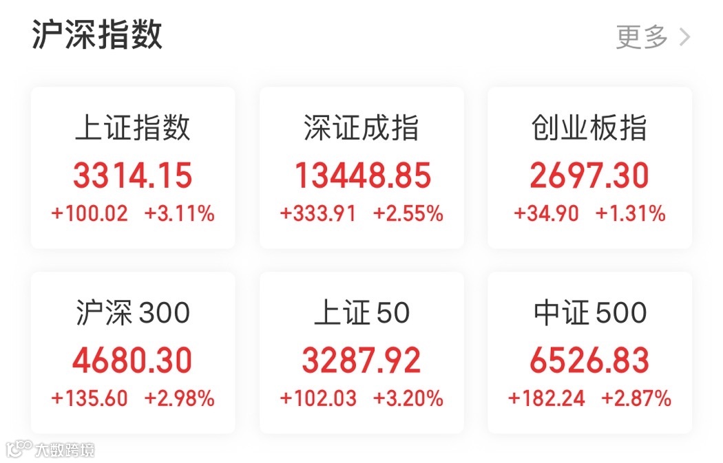 本周一,A股市场展开大反攻,金融股、强周期全面爆发,沪指上涨100点,涨幅超3%,重返3300点。上证指数收盘涨3.11%,报3314.11点;深证成指涨2.55%,报13448.85点;创业板指涨1.31%,报2697.3点;两市成交额连续13日突破万亿。