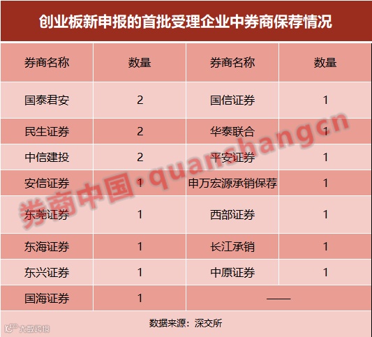 券商中国记者此前从券商了解到,不少投行抓紧申报新项目,旨在争取成为首批,那么哪些投行拿到“头筹”?根据记者梳理,首批受理名单中共涉15家保荐机构。其中国泰君安、中信建投、民生证券的保荐家数相对较多,各有2家。