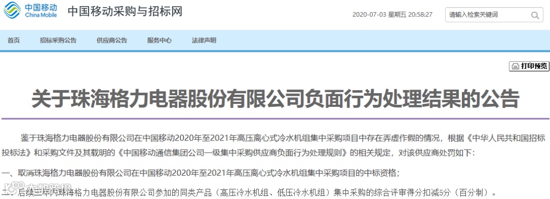 近日,中国移动采购与招标网发布的《关于珠海格力电器股份有限公司负面行为处理结果的公告》显示,珠海格力电器股份有限公司在中国移动2020年至2021年高压离心式冷水机组集中采购项目中存在弄虚作假的情况,决定对其处罚,取消本次格力电器中标资格,后续三年内格力电器参加同类产品集中采购的综合评审得分扣减5分(百分制)。