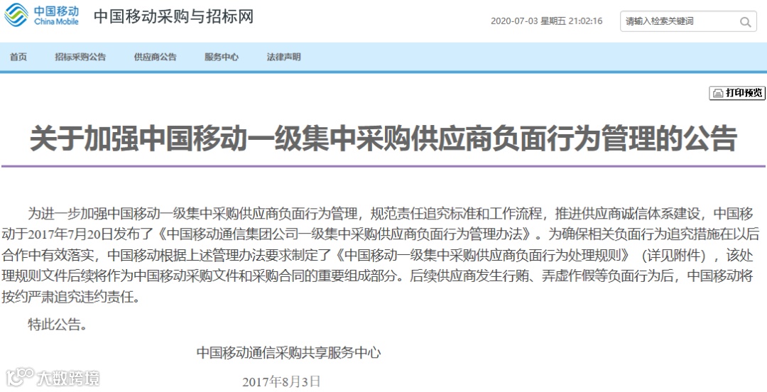 2017年8月3日,中国移动发布“关于加强中国移动一级集中采购供应商负面行为管理的公告”,中国移动制定了《中国移动一级集中采购供应商负面行为处理规则》,对于供应商发生行贿、弄虚作假等负面行为的,中国移动将按约严肃追究违约责任。