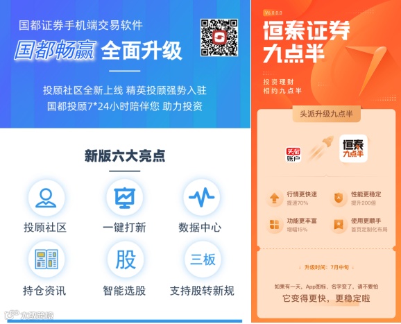 此外,借着日常火热时机,多家券商APP也随即推出全面升级。例如,国都证券、恒泰证券等多家中型券商均发布APP的新版本升级,更强调性能稳定、功能丰富等特点。