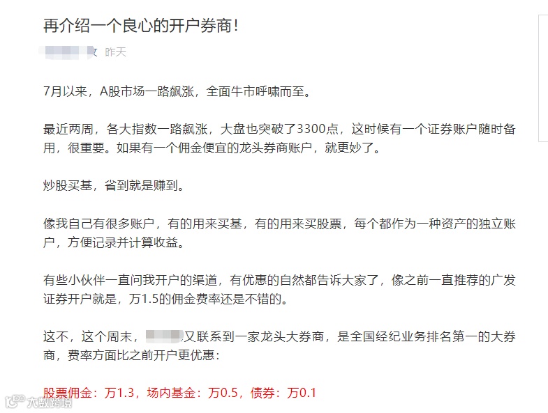 在头部流量一早被东方财富“收割”后,就近期来看,华泰证券通过微信公众号推广的力度同样明显。券商中国记者关注到,近期一些在业内并不算知名的财经号,均“不约而同”地开始推荐华泰证券开户,并推出各种开户专项优惠,包括VIP佣金优惠、1V1投顾服务、新客户理财等。