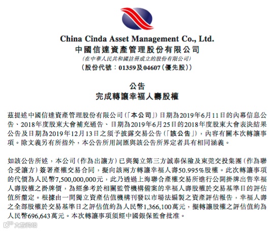 7月17日晚,中国信达在港交所公告称,公司于近日收到《中国银保监会关于幸福人寿保险股份有限公司变更股东的批复》(银保监复〔2020〕442号),批准本公司将所持有的幸福人寿50.995%股权分别转让予诚泰保险和东莞交投集团,并按照有关规定办理变更手续。