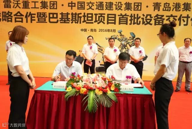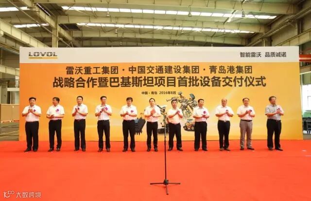 2016年8月12日, 雷沃重工集团与中国交通建设集团、青岛港集团战略合作暨巴基斯坦项目首批设备交付仪式在雷沃重工隆重举行。本次交付的52台FL958G-ETX雷沃装载机将奔赴巴基斯坦“一带一路”旗舰项目——中巴经济走廊。雷沃重工集团董事长、总经理王桂民,中国交通建设集团华东区总经理王永强,青岛港集团副总裁张江南,中国路桥集团物资装备部总经理吴金海,青岛市黄岛区副区长孙大贵等领导出席仪式。
