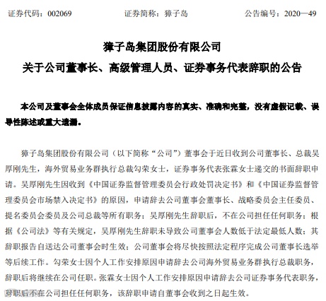 6月24日,獐子岛公告称,公司董事会于近日收到公司董事长、总裁吴厚刚,海外贸易业务群执行总裁勾荣,证券事务代表张霖递交的书面辞职申请。此外,此前公司控股股东投资发展中心收到大连市人民检察院《起诉书》,投资发展中心于2020年6月23日收到判决书,经大连市中级人民法院审理判决投资发展中心犯内幕交易罪,判处罚金1200万元,追缴投资发展中心非法所得1131.6万元。
