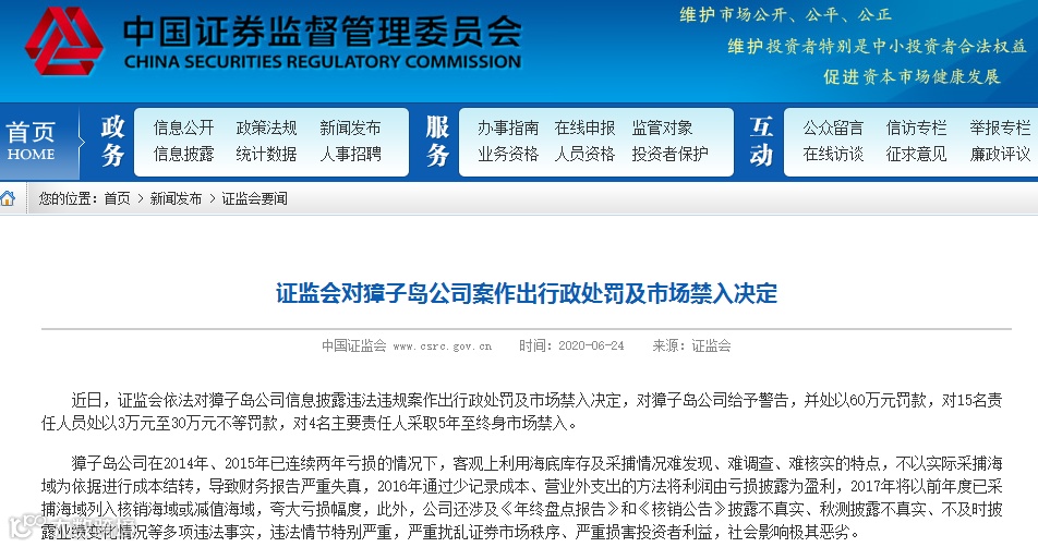 近日,证监会对獐子岛案正式作出行政处罚。