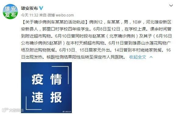 据@雄安发布,病例12,车某某,男,10岁,河北雄安新区安新县人,郭里口村学校四年级学生。