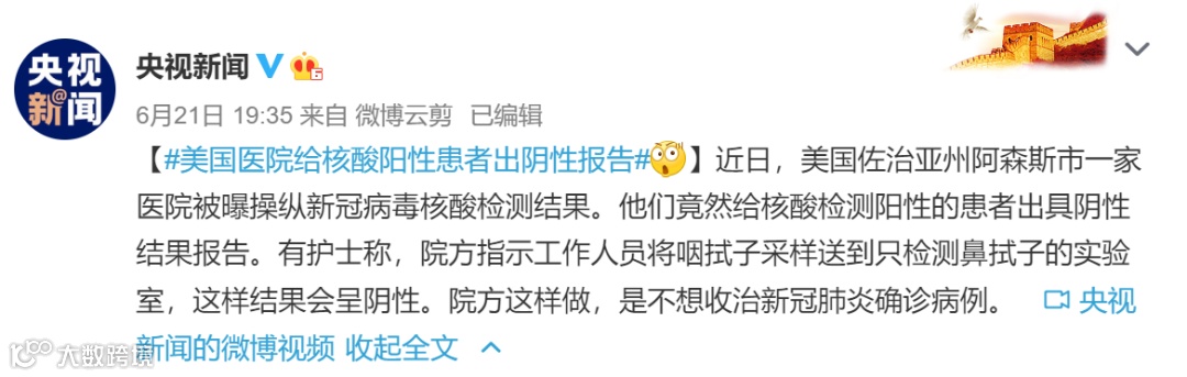 据央视新闻6月21日晚消息,近日,美国佐治亚州阿森斯市一家医院被爆操纵新冠病毒核酸检测结果。他们竟然给核酸检测阳性的患者出具阴性结果报告。