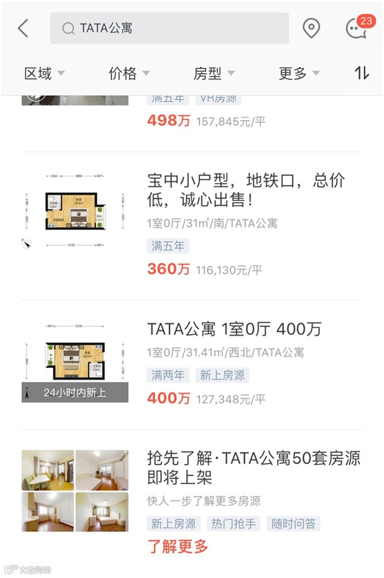 TATA公寓就是其中之一。链家APP的数据显示,TATA公寓房源下架前的挂牌价在每平方米8万至15万元之间。而去年6月,面积在30平方米左右的TATA公寓房源,成交均价仅在每平方米7万元左右。