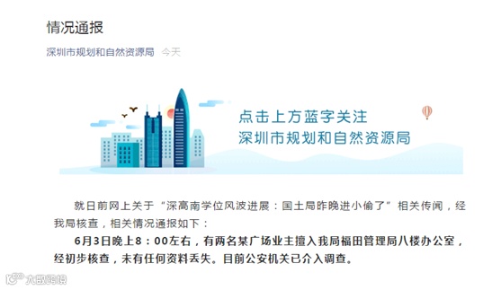 此外,就这一事件,网上还传出了“深高南学位风波进展:国土局昨晚进小偷了”相关传闻。对此,深圳市规划和自然资源局的官方微信在5日发出情况通报:“经我局核查,相关情况通报如下:6月3日晚上8:00左右,有两名某广场业主擅入我局福田管理局八楼办公室,经初步核查,未有任何资料丢失。目前公安机关已介入调查。”