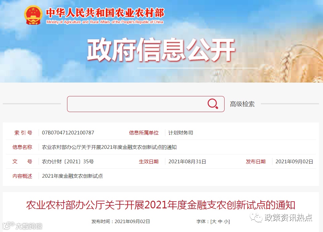 为深入贯彻落实中央一号文件部署,强化农业农村优先发展投入保障,加快破解农村金融发展的痛点、难点和瓶颈制约,更好地撬动和引导金融社会资本投向农业农村,我部决定以政府购买服务方式开展2021年度金融支农创新试点。现就有关事宜通知如下。