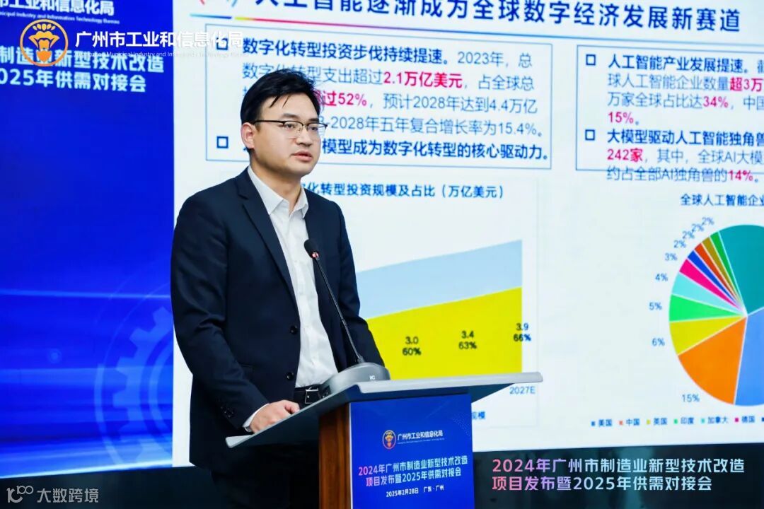分享环节,信通院工业互联网创新中心(广东)有限公司副总经理赵瑞龙受邀参加会议并发表主题为《人工智能赋能制造业技术创新与转型升级》主旨报告,从算力、算法、算料等环节详解人工智能在制造业企业数字化、智能化中的重要作用,为数字化转型路径提供参考。