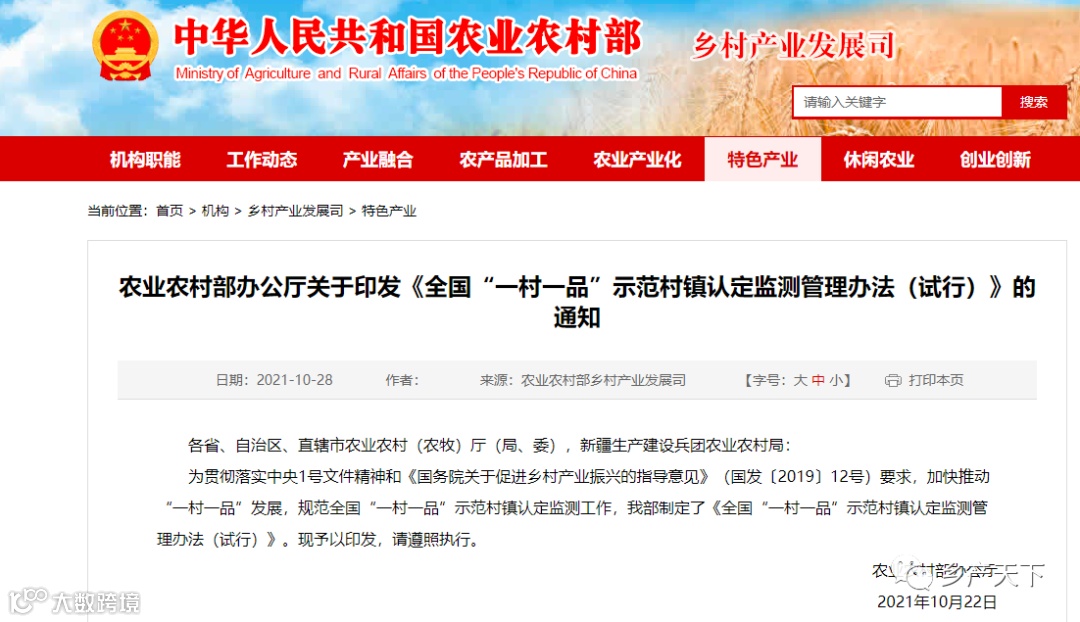 为贯彻落实中央1号文件精神和《国务院关于促进乡村产业振兴的指导意见》(国发〔2019〕12号)要求,加快推动“一村一品”发展,规范全国“一村一品”示范村镇认定监测工作,我部制定了《全国“一村一品”示范村镇认定监测管理办法(试行)》。现予以印发,请遵照执行。