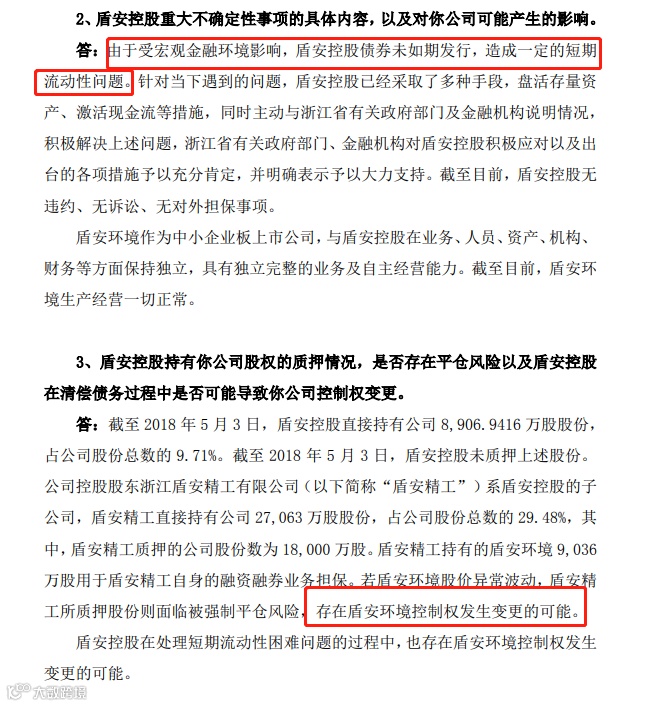 2018年5月2日,盾安环境、江南化工同时发布公告,称盾安集团存在重大不确定事项,且该事项对公司有重大影响,股票即日起停牌。5月3日-4日,江南化工、盾安环境分别回复深交所问询称,存在公司控制权变更的可能。