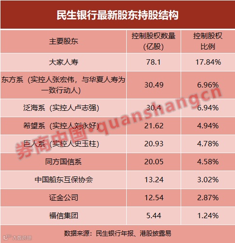 截至目前,民生银行主要股东包括:大家人寿、东方系(实控人张宏伟,与华夏人寿为一致行动人)、泛海系(实控人卢志强)、巨人系(实控人史玉柱)、希望系(实控人刘永好)、同方国信系、中国船东互保协会、福信集团。