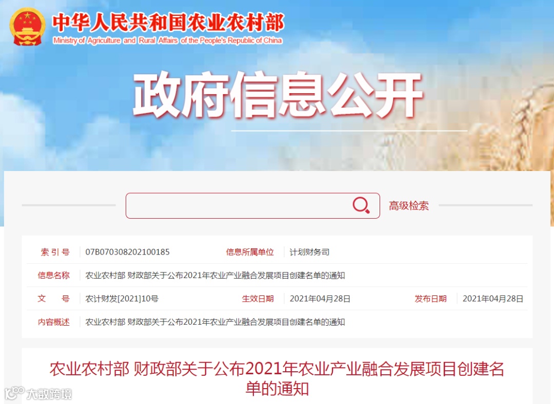 2021年农业产业融合发展项目创建名单的通知