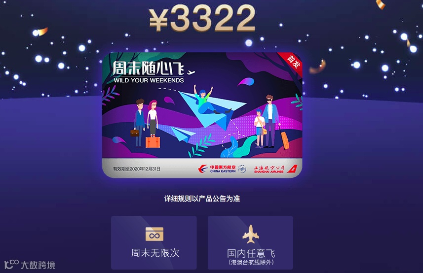 6月18日,东方航空在自家APP渠道上线了“周末随心飞”产品,限量发售,每份售价3322元,每位旅客最多限购10套。旅客购买该产品并激活后,可在2020年内的任意周六和周日,不限次数乘坐东航和上航航班,飞国内除港澳台地区外的各大城市。