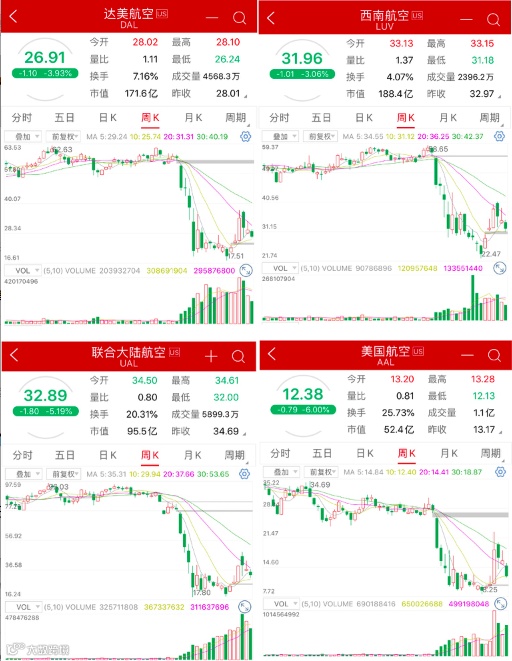 今年以来,美国航空下跌56%,达美航空跌53%,西南航空跌40%,美国联合航空跌62%。