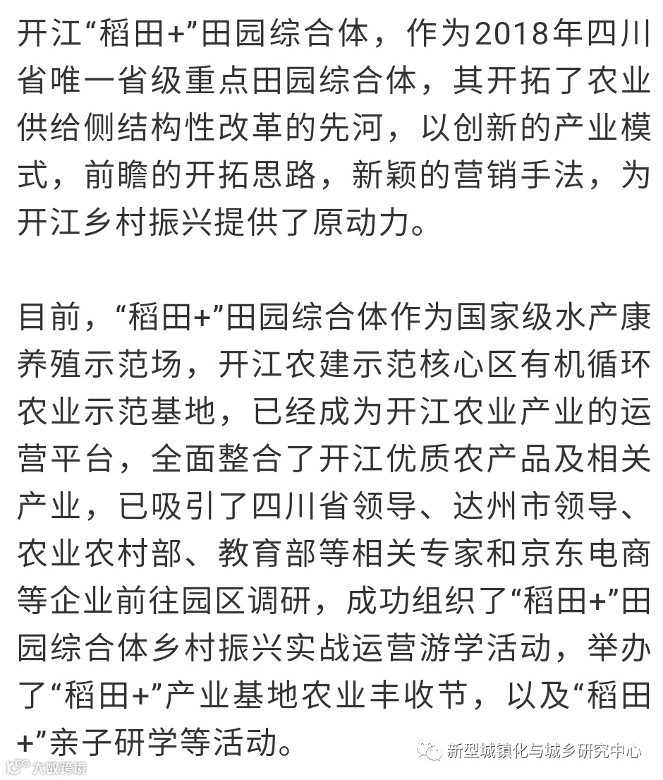 对“稻田+”经济发展模式的创新研究,全国首创 “乡村振兴战略规划+田园综合体+农业供给侧改革+农村综合配套改革”发展新模式,参与投资开发运营“稻田+”田园综合体,编制《开江县省级田园综合体建设试点规划和实施方案》和《开江县“稻田+”现代农业产业园总体规划》,助力开江成功申报省级重点田园综合体,并获省市两级财政连续三年每年4500万的扶持资金支持。