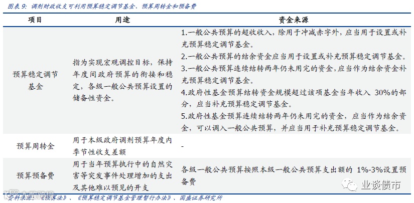 ⑨预算稳定调节基金调入反映的是用于弥补收支缺口的预算稳定调节基金,主要目的在于管控地方政府每年超收收入。按照《预算法》规定,各级一般公共预算可以设置预算稳定调节基金,用于弥补以后年度预算资金的不足,各级政府上一年预算的结转资金,应当在下一年用于结转项目的支出;连续两年未用完的结转资金,应当作为结余资金管理。各级一般公共预算年度执行中有超收收入的,只能用于冲减赤字或者补充预算稳定调节基金。各级一般公共预算的结余资金,应当补充预算稳定调节基金。