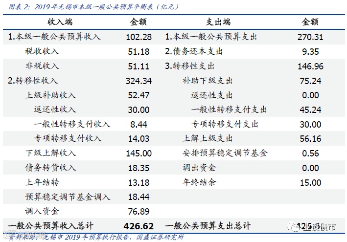 以市级一般公共预算平衡为例,地方政府有全市、市本级两个口径的平衡表。由于地方各级总预算由本级预算和汇总的下一级总预算组成,因此只考虑市本级财政收支时可得市本级一般公共预算平衡表;当考虑下属区县的财政收支情况时,可得全市一般公共预算平衡表,全市一般公共预算收入等于市本级收入与各区县收入的总和,例如无锡全市一般公共预算收入达1036.33亿元,其中市本级一般公共预算收入达102.28亿元、下辖区县一般公共预算收入合计达934.05亿元。