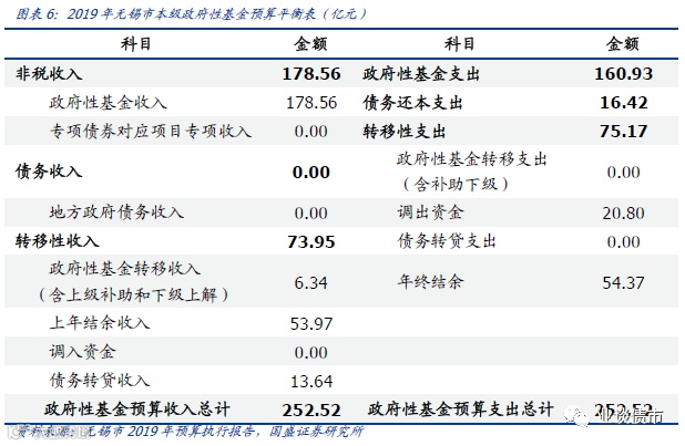国有土地使用权出让收入是政府性基金收入的最主要构成。国有土地使用权出让收入反映不含计提和划转部分的国有土地使用权出让收入,具体可分为国有土地使用权出让收入、土地出让价款收入、补缴的土地价款、划拨土地收入、缴纳新增建设用地土地有偿使用费、其他土地出让收入5类。以无锡市为例,2019年全市国有土地使用权出让收入达733.4亿元,占政府性基金收入的91.98%。值得注意的是,由于许多区县的土地出让在市级土地交易平台完成,相关款项由购地企业支付给市级财政后转给区县级财政,因此部分区县国有土地使用权出让收入为0,但政府性基金上级补助收入规模较大。